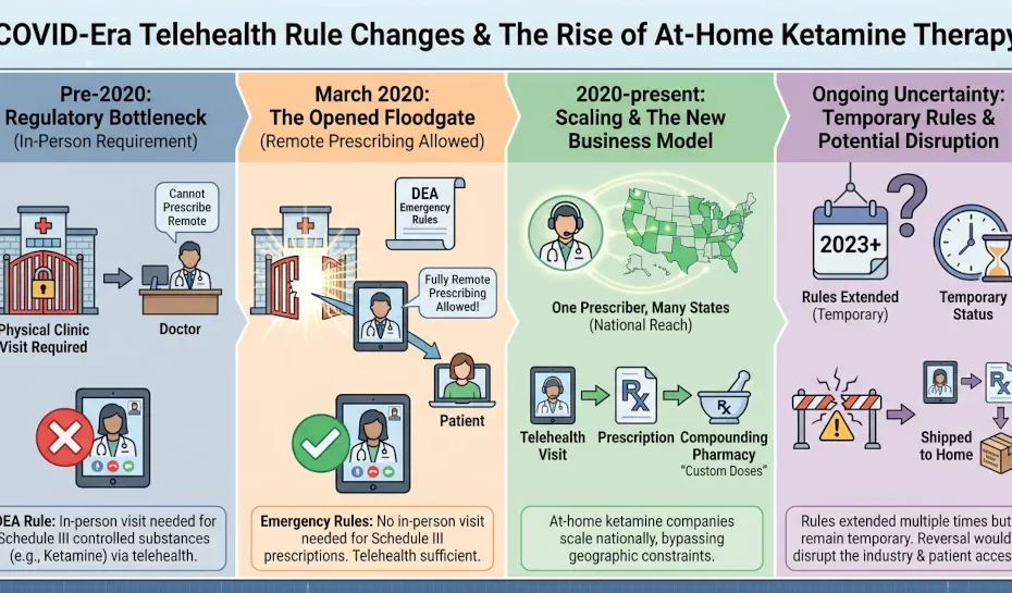 At-home ketamine therapy combines remote psychiatric evaluation with self-administered ketamine (typically sublingual tablets or nasal spray) for treating depression and anxiety. The concept exploded in 2021 when the DEA temporarily waived the Ryan Haight Act’s in-person requirement during COVID-19, enabling telehealth companies like Mindbloom and Better U to offer virtual assessments with medication delivered to patients’ homes.